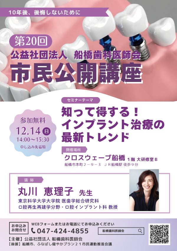 船橋・鎌ケ谷の市民の皆様の健康維持や増進、お口の知識の向上のために、年一回「市民公開講座」という講演会を平成17年より開催しています。20回目となる今年は、「10年後、後悔しないために 知って得する!インプラント治療の最新トレンド」というテーマで講師の先生が楽しく、わかりやすく講義します。入場料は無料ですので、たくさんの市民の皆様のご参加をお待ちしています。